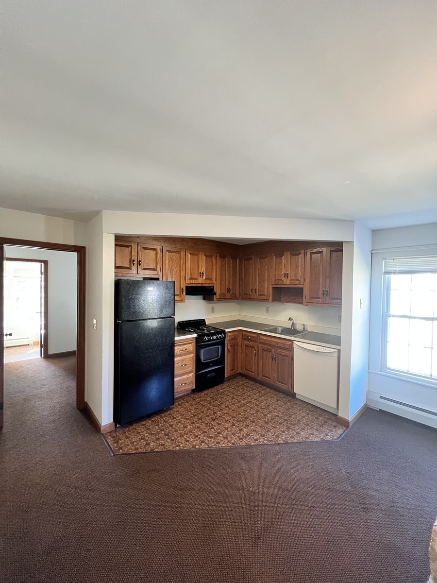 carpeted floors, kitchens with stove,dishwasher and frigerator; off street parking
